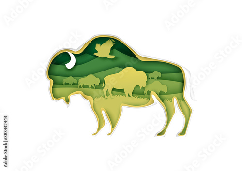 Силуэт большого буйвола с природным пейзажем прерий, летящая птица, американский бизон внутри, векторная иллюстрация в стиле бумажного искусства. Красота природы. Спасайте животных, защищайте дикую природу. Многократное воздействие.