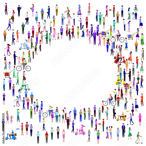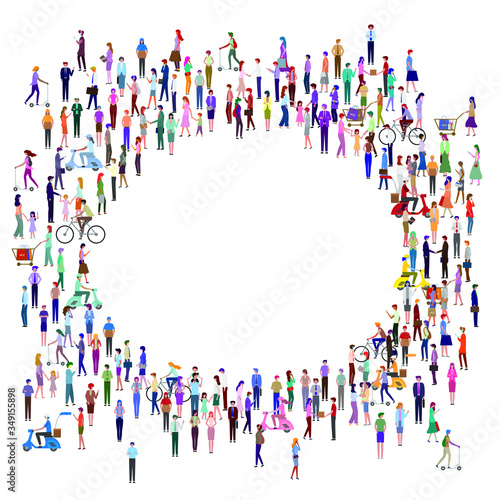 Большая группа людей, образующих рамку в форме человеческого сердца, стоящих вместе, плоская векторная иллюстрация. Собирается толпа людей. Любовь, признательность, социальная общность.
