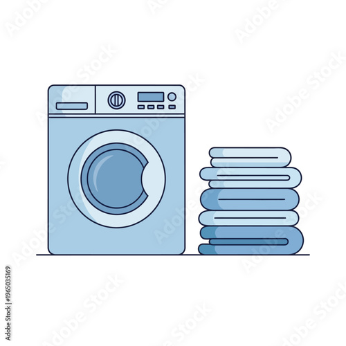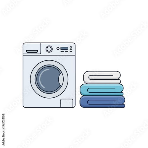 Плоский векторный шаблон баннера самообслуживания прачечной самообслуживания. Линейный плакат со стиральным порошком, автоматической стиральной машиной, иллюстрацией аккуратно сложенной стопки чистого белья
