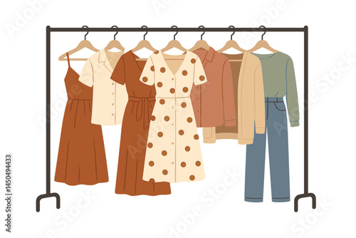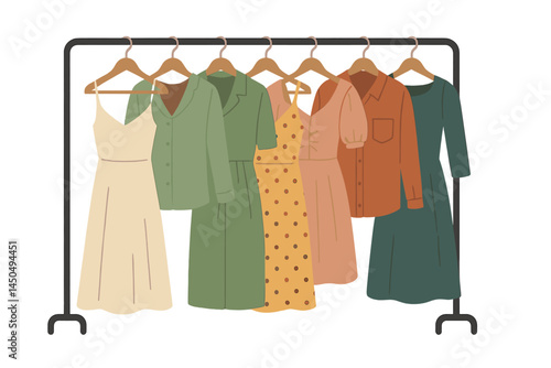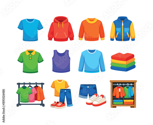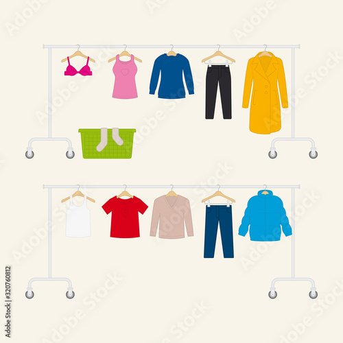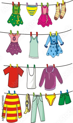 Набор белья, плоская векторная иллюстрация, изолированная на белом фоне. Корзина для белья. Куча грязной одежды. Чистая и грязная белая и цветная мужская одежда, полотенца. Выстиранная одежда висит на бельевой веревке.