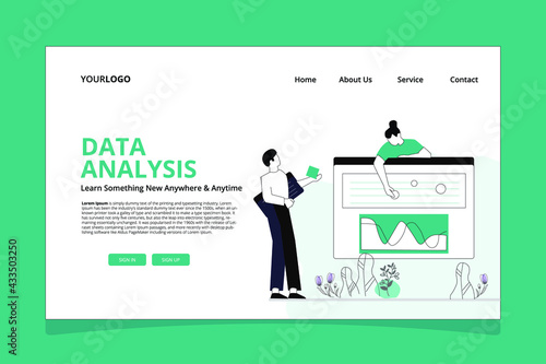 Векторный шаблон веб-сайта прачечной, дизайн веб-страницы и целевой страницы для разработки веб-сайтов и мобильных сайтов. Крошечные люди загружают большую стиральную машину и кладут в нее монету. Прачечная самообслуживания.