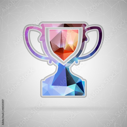 Векторный кубок победителя в многоугольном художественном стиле. Наградной кубок из низкополигональной каркасной сетки с рассеянными частицами и световыми эффектами на темно-синем фоне. Шаблон дизайна баннера плаката бизнес-концепции лидерства.