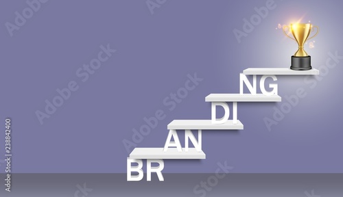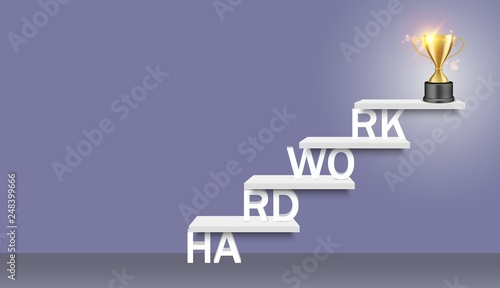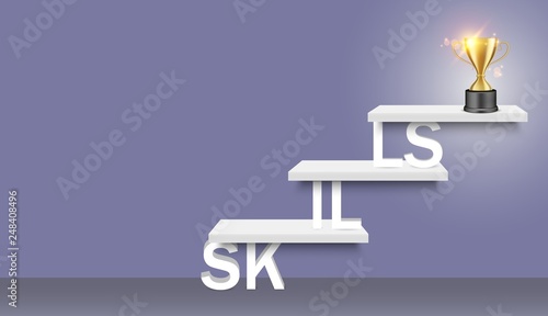 Лестница для изучения слов с кубком для награждения трофеями наверху. Векторная реалистичная иллюстрация. Концепция лестницы к успеху в бизнесе, профессиональному росту и обучению персонала для веб-сайта, плаката, баннера.