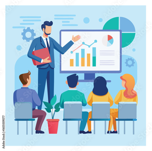 Векторная иллюстрация учителя химии, профессора университета, читающего лекцию. Лекционный зал, интерьер классной комнаты. Дизайн в плоском стиле.