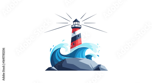 Маяк на побережье океана и бушующие волны, векторная иллюстрация в стиле бумажного искусства. Маяк, символизирующий путь вперед, безопасность. Летнее морское путешествие, концепция путешествия, приключения в стиле вырезки из бумаги.