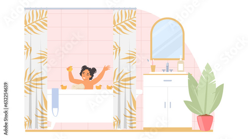 Маленький ребенок дошкольного возраста играет и веселится, принимая ванну дома векторная иллюстрация