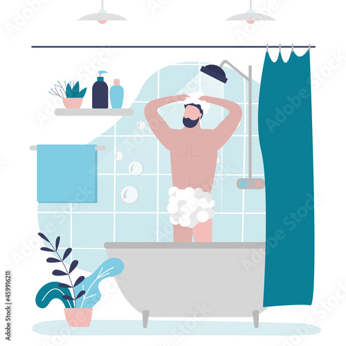 Маленький мальчик-персонаж, принимающий душ дома векторная иллюстрация. Концепция повседневной гигиены детей