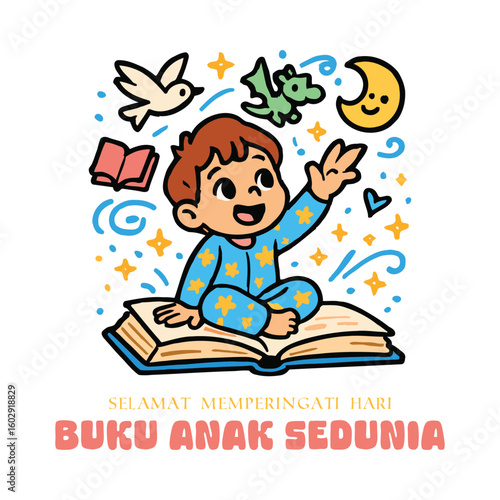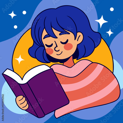 Маленькая девочка читает книгу на кровати. Векторная иллюстрация в стиле комического поп-арта. Девушка мечтает о чем-то, читая сказку.