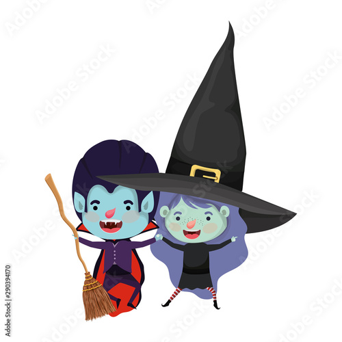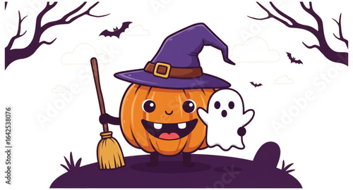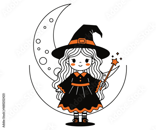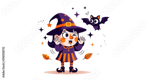 Маленькая девочка-персонаж мультфильма "Ведьма" в праздничном костюме читает заклинание в волшебной книге, стоя над кипящим котлом векторная иллюстрация. Концепция Хэллоуина и колдовства