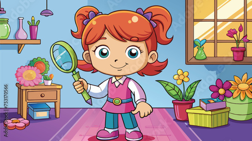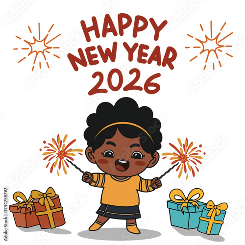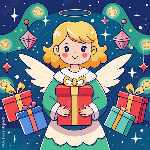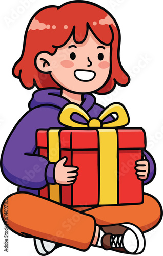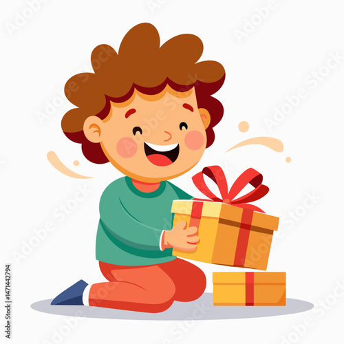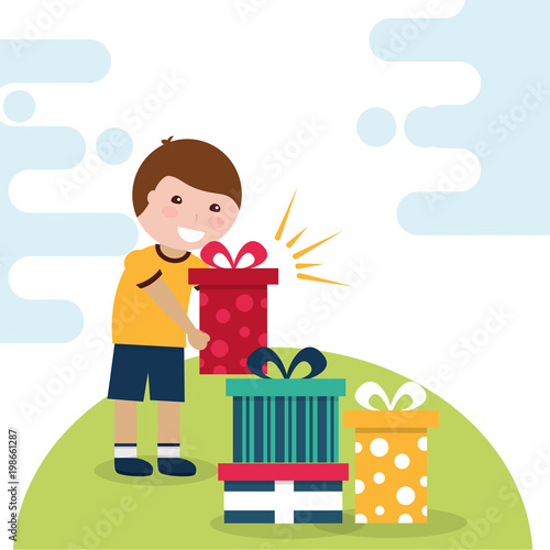 Маленькая девочка с подарками и подарочными коробками. Концептуальный плакат на день рождения. Векторная иллюстрация в стиле комического ретро-поп-арта. Элементы мультяшного дизайна и иконки.