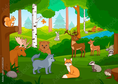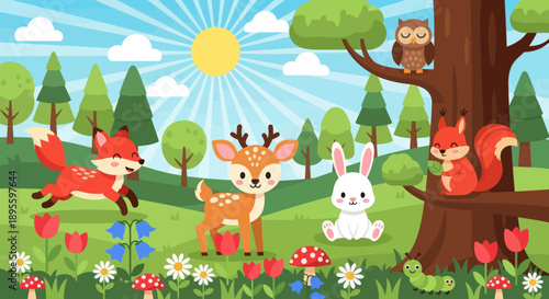 Маленькие дети играют в прятки в векторной иллюстрации леса. Мультяшные детские летние каникулы в горном лагере