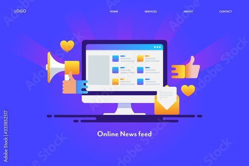 Векторный шаблон веб-сайта с прямой трансляцией, дизайн веб-страницы и целевой страницы для разработки веб-сайтов и мобильных сайтов. Люди смотрят видео с помощью настольных и портативных компьютеров, смартфонов. Онлайн-трансляция.