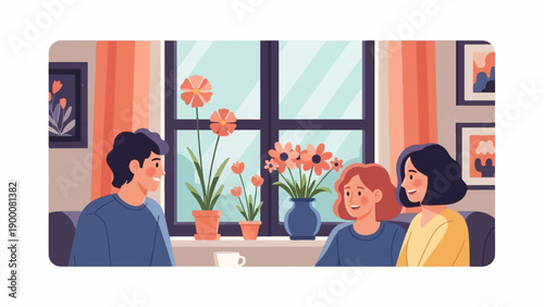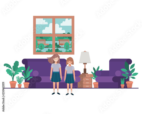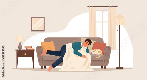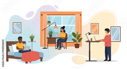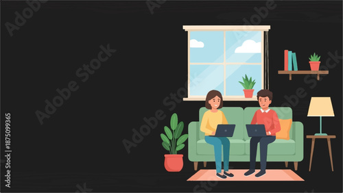 Интерьер гостиной и девушка, работающая на ноутбуке, лежащем на диване векторная плоская иллюстрация. Женская гостиная с уютным диваном у окна, журнальным столиком, торшером, книгами на ковре. Современный домашний интерьер