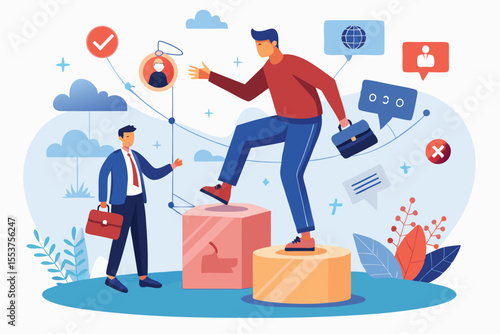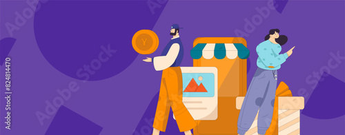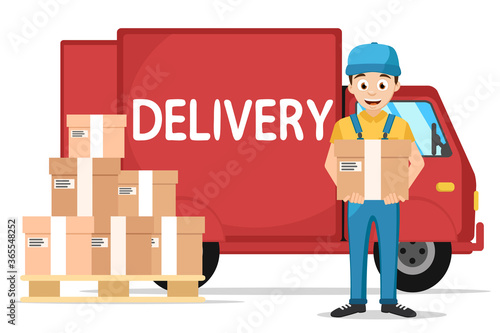Векторная иллюстрация носильщика, толкающего тележку с холодильником в картонной коробке. Услуги компании по переезду и доставке грузов. Концепция погрузчика элемент дизайна в плоском стиле.