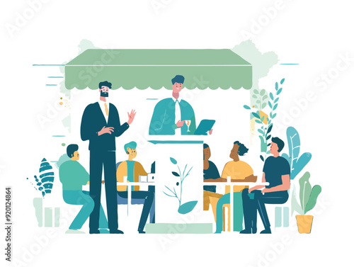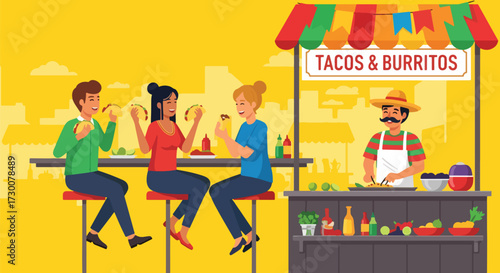 Местный рынок. Рыночные прилавки, прилавки с едой. Фермеры продают фрукты, специи, рыбу, мясо, сыр, хлеб, плоские векторные иллюстрации. Экологически чистые фермерские продукты, натуральные и органические фрукты и овощи.