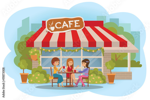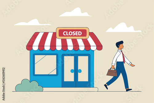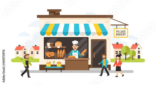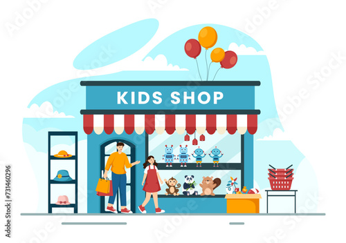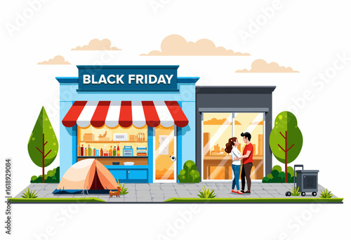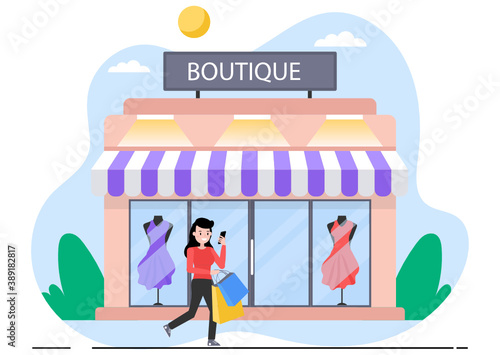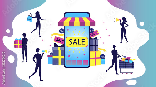Векторная иллюстрация мероприятия по открытию магазина на местной маркет-стрит. Женщина-промоутер привлекает клиентов и гостей для совершения покупок, чтобы они стали первыми покупателями