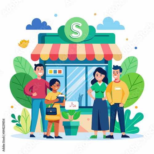 Местный рынок, векторная иллюстрация дизайна в плоском стиле. Женский персонаж-продавец или фермер, продающий натуральные органические фрукты и овощи молодой женщине-покупателю. Здоровая свежая органическая пища.