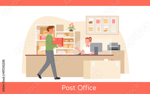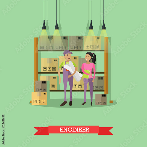Концептуальный баннер службы логистики и доставки. Работники склада. Векторная иллюстрация в плоском мультяшном стиле. Курьер, работающий на складе и отправляющий товары.