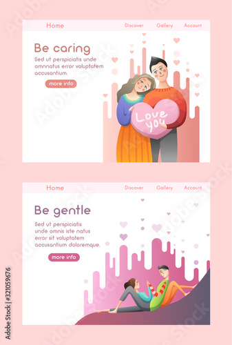 Прекрасная пара держит большое сердце и обнимает друг друга. Концепция любви и отношений. Пригласительный билет на свадьбу. Векторный шаблон дизайна веб-сайта. Иллюстрация веб-сайта целевой страницы.