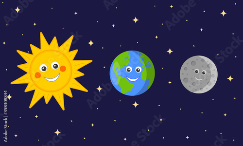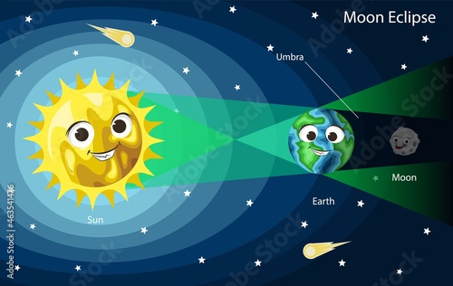 Диаграмма лунного затмения. Симпатичное мультяшное Солнце, Земля и Луна с улыбающимися лицами, векторная иллюстрация. Детский плакат по астрономии.