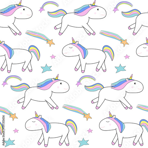 Бесшовный узор "Волшебный единорог". Векторные нарисованные от руки летающие романтические единороги с радугами и облаками.