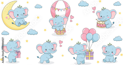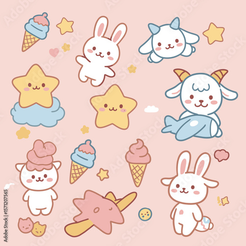 Милый набор иконок волшебного единорога. Векторная рисованная иллюстрация романтического мифического существа единорога и радуги, облаков, сердец, волшебной палочки, короны, мороженого, цветов.