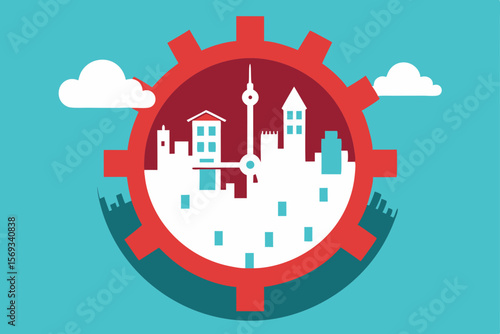 Увеличительное стекло с элементами города внутри, векторная иллюстрация в стиле бумажного искусства. Поиск дома, концепции недвижимости.