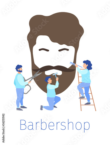 Микро-визажисты мужского и женского пола наносят профессиональный макияж на огромное мужское лицо, векторная иллюстрация. Услуги салона красоты, курсы макияжа концепция веб-баннера, страницы веб-сайта и т.д.