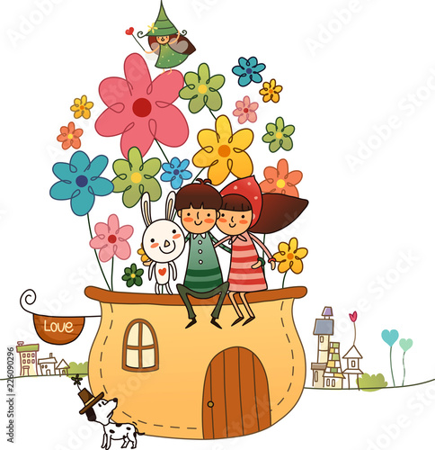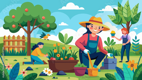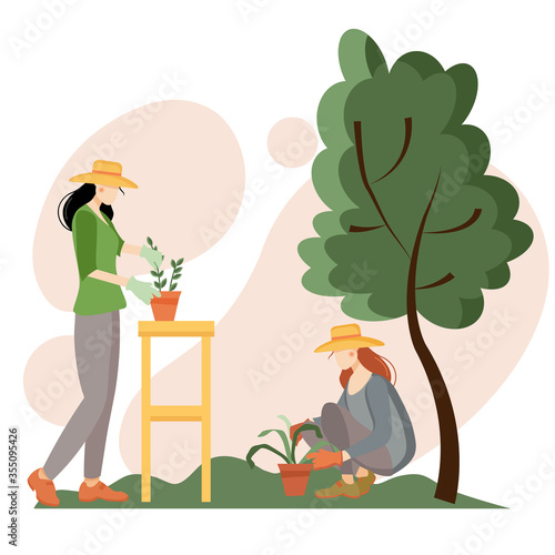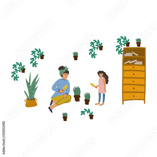 Векторная мужская и женская роспись на стене дома. Художник-фрескист за работой над иллюстрацией. Создание цветочного рисунка на квартире здания. Хобби в области искусства, дизайн экстерьера