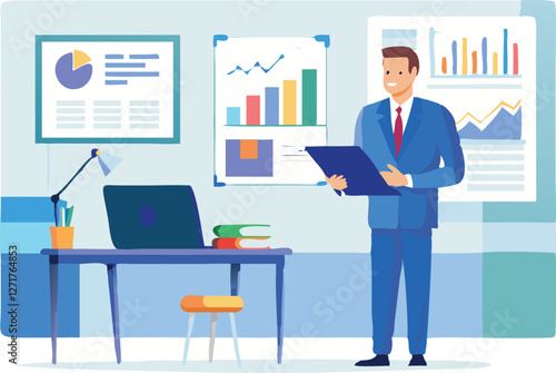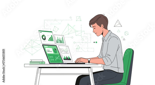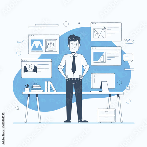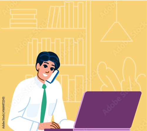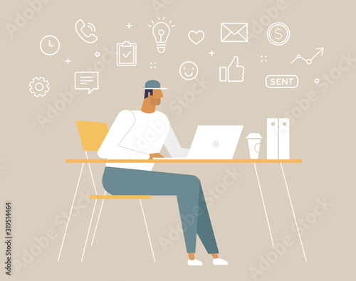 Мужчина-фрилансер, работающий удаленно со своего рабочего места. Внештатная векторная иллюстрация концепции в плоском дизайне. Рабочее место в домашнем офисе. Покупки в Интернете.