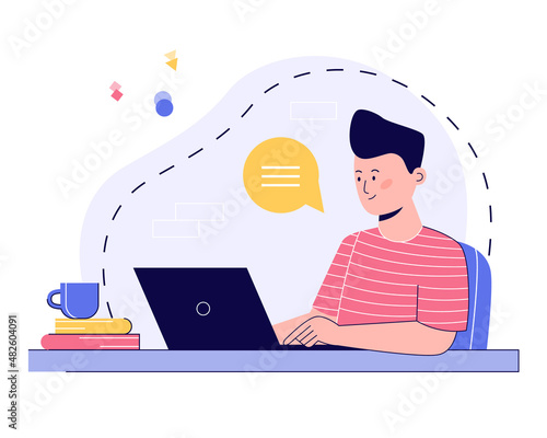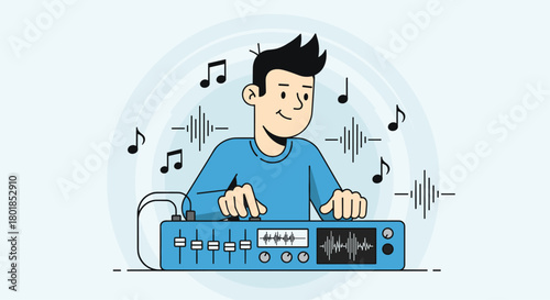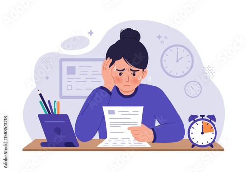 Музыкант-мужчина, переживающий творческий кризис или блок, плоская векторная иллюстрация. Грустный человек с гитарой сидит за столом с чистым листом бумаги на нем. Творческий кризис, тревога, усталость, депрессия.