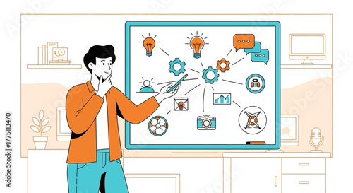 Векторный плакат концепции ухода за мужской кожей и косметикой. Мужчина наносит бесцветную помаду, стоя перед зеркалом в ванной. Мужская косметика, уход за кожей и косметические процедуры.