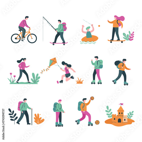 Мужчины и женщины занимаются спортом дома и на открытом воздухе. Векторная иллюстрация набор людей тренировки, занимаясь йогой и бегом. Растяжка, езда на велосипеде, катание на коньках, тяжелая атлетика.