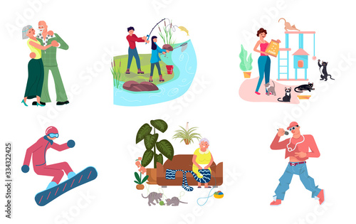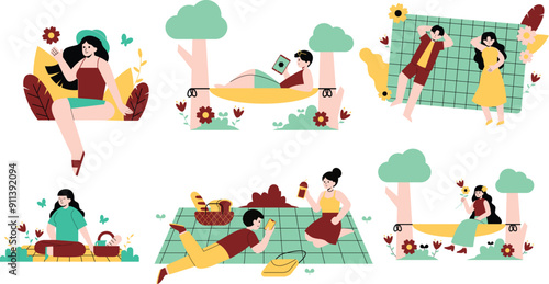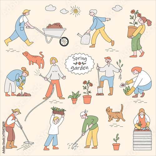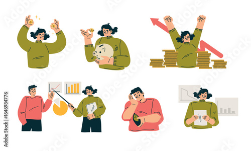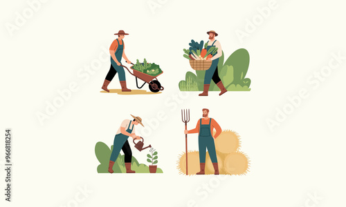 Мужчина и женщина-персонажи собирают фрукты на ферме Грейден. Набор векторных иллюстраций фермеров, работающих в яблоневом саду и собирающих фрукты с дерева. Сезон сбора урожая, сельское хозяйство, ферма.