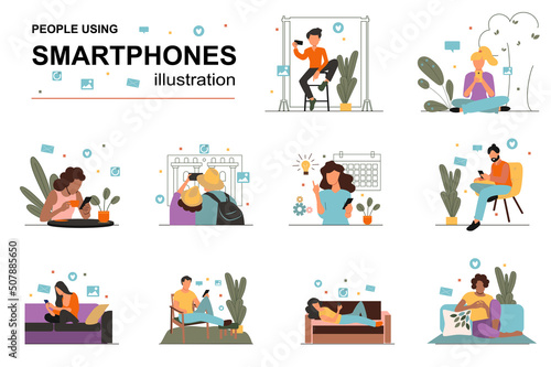 Мужчина и женщина-персонажи, читающие книги дома и в библиотеке. Набор векторных иллюстраций людей, читающих книгу. Студенты учатся и готовятся к экзамену.