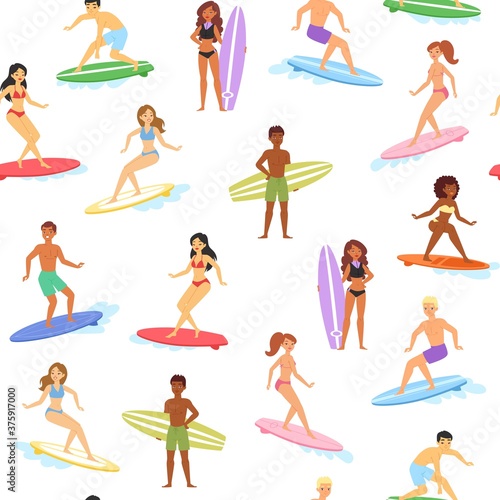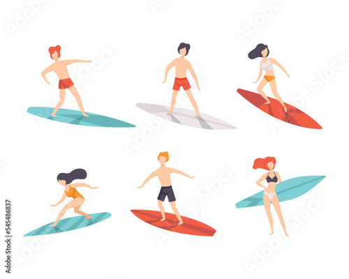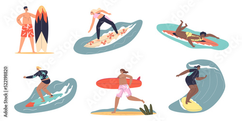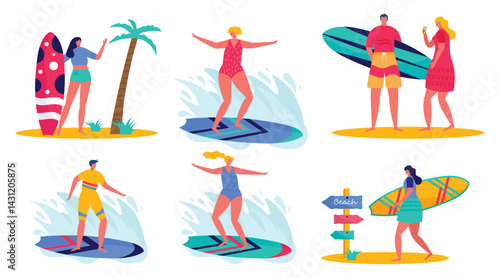 Мужчина и женщина в купальниках, изолированных от серферов. Группа счастливых молодых спортивных людей с досками для серфинга, наслаждающихся экстремальными видами спорта на воде векторная иллюстрация