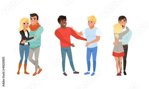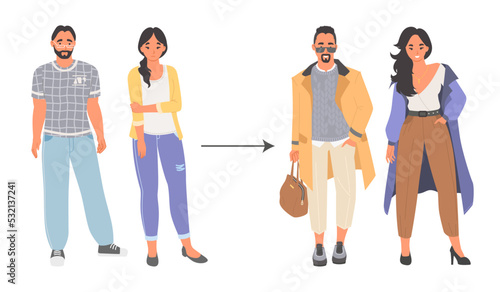 Векторная сцена преображения мужчины и женщины. Трансформация имиджа в стиле People. Женский и мужской персонажи меняют наряд. До и после иллюстрации