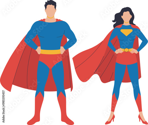 Мужчина и женщина-супергерои в маске и плаще векторная иллюстрация. Супермен и суперженщина изолированы на белом фоне. Героиня женского пола и герой мужского пола - мультипликационный персонаж