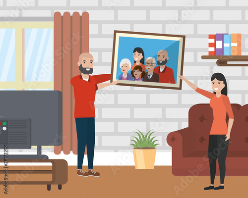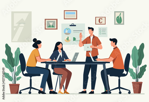 Молодой человек, выбирающий цвет краски для стен, плоская векторная иллюстрация. Женщина-дизайнер интерьера предлагает образцы цветов, палитру красок для украшения дома, ремонта квартиры. Услуги по благоустройству дома.
