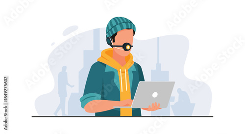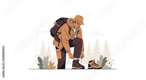 Персонаж-альпинист, упаковывающий рюкзак для пешего туризма, векторный значок, изолированный на белом фоне.