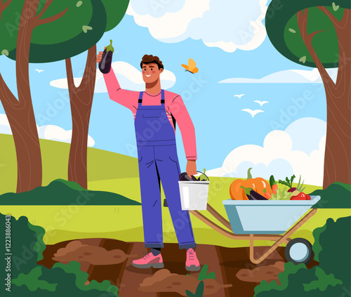 Человек собирает грибы в лесу. Мужчина ловит рыбу на озере. Иллюстрация векторной концепции летних каникул и выходных дней. Рыбак на пристани, лесные грибы. Шаблон дизайна веб-сайта.