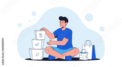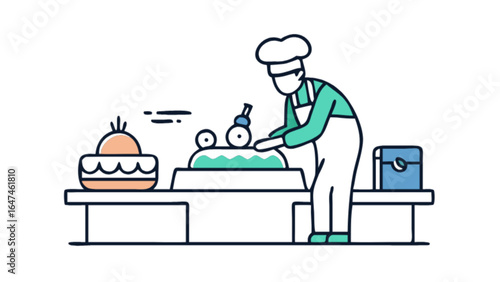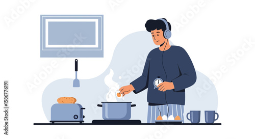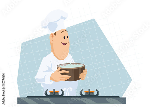 Мужчина готовит еду, готовит ужин на кухне, плоская векторная иллюстрация. Работа по дому, домашние хлопоты, ведение домашнего хозяйства, хобби.