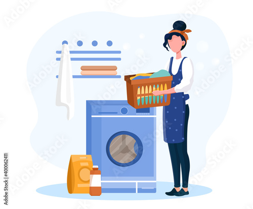 Мужчина стирает белье в стиральной машине, плоская векторная иллюстрация. Работа по дому, домашние хлопоты, ведение домашнего хозяйства.