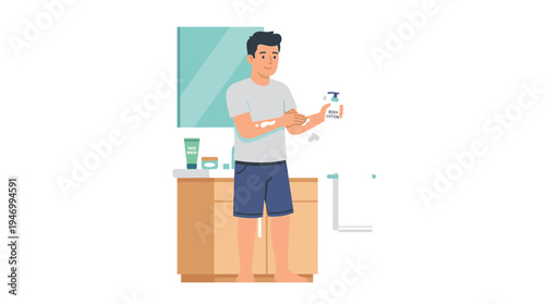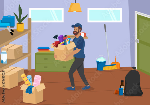 Мужчина вытирает пыль с мебели в гостиной, плоская векторная иллюстрация. Работа по дому, домашние хлопоты, ведение домашнего хозяйства, уборка дома.