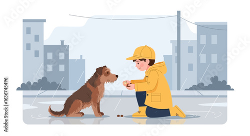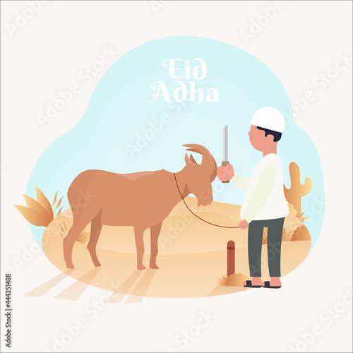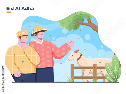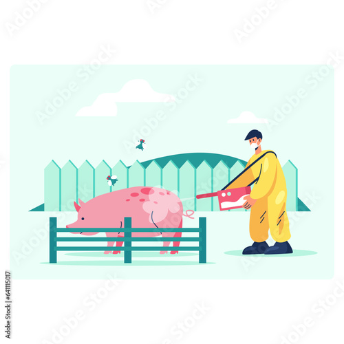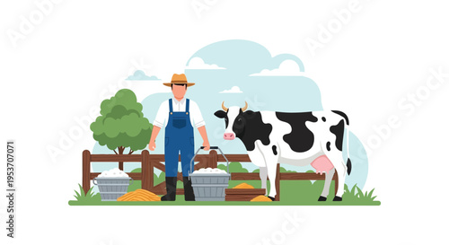 Мужчина-фермер, ухаживающий за коровой в стойле векторная иллюстрация. Мужчина-работник фермы, стоящий с вилами у домашнего скота, изолированный на белом фоне. Концепция сельского хозяйства и сельских угодий