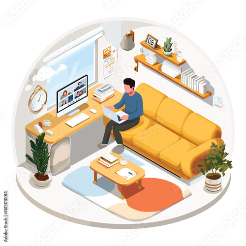 Молодой человек-геймер, играющий в футбольную видеоигру по телевизору с контроллером, сидящим на диване, плоская векторная изометрическая иллюстрация. Онлайн-игры, игры для видео-консолей.
