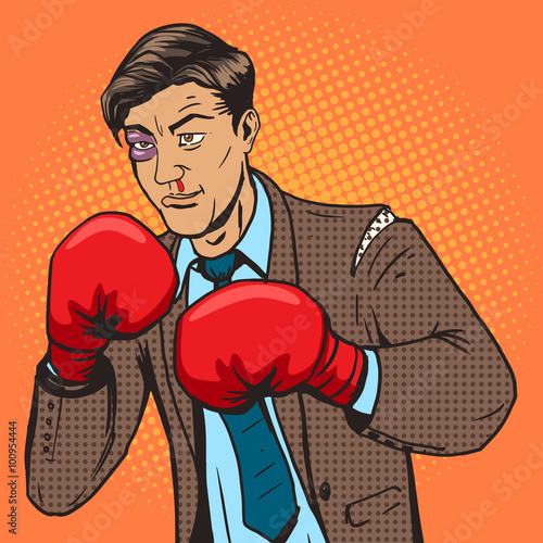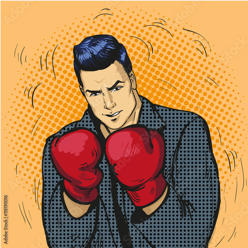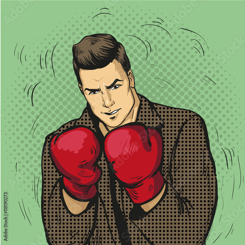Человек в боксерских перчатках векторная иллюстрация в стиле комического поп-арта. Бизнесмен, готовый бороться и защищать свою бизнес-концепцию.