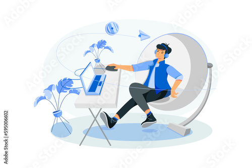 Молодой человек в наушниках слушает аудиопрограмму, музыку, аудиокнигу на смартфоне, плоская векторная иллюстрация. Подкастинг, онлайн-образование, радиоподкаст.