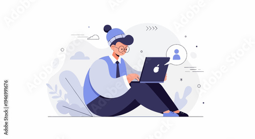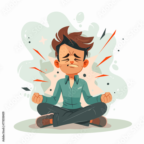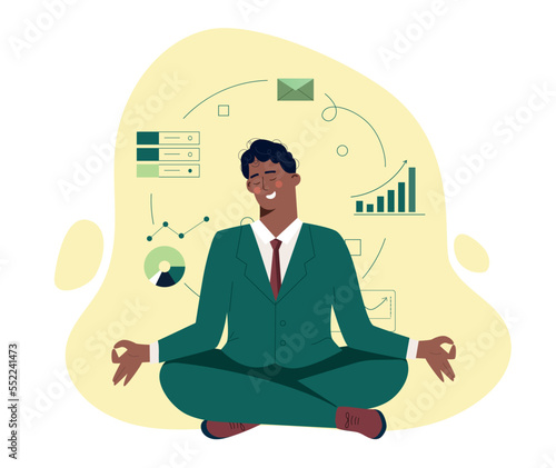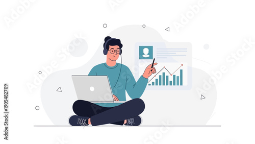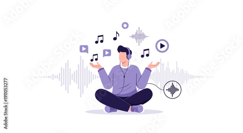 Молодой человек в наушниках слушает аудиопрограмму, музыку, аудиокнигу на смартфоне, плоская векторная иллюстрация. Подкастинг, онлайн-образование, радиоподкаст.