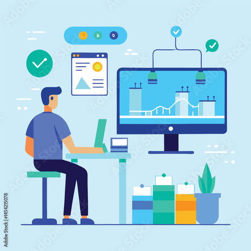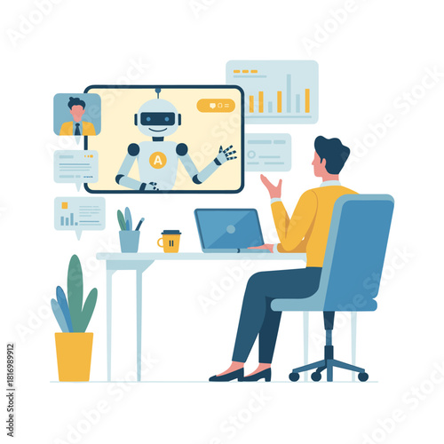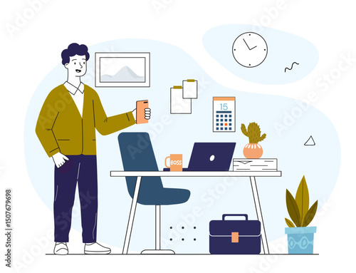 Человек в наушниках выбирает подкаст на портативном компьютере, чтобы начать просмотр и прослушивание, плоская векторная иллюстрация. Подкастинг, концепция мультимедийного контента.